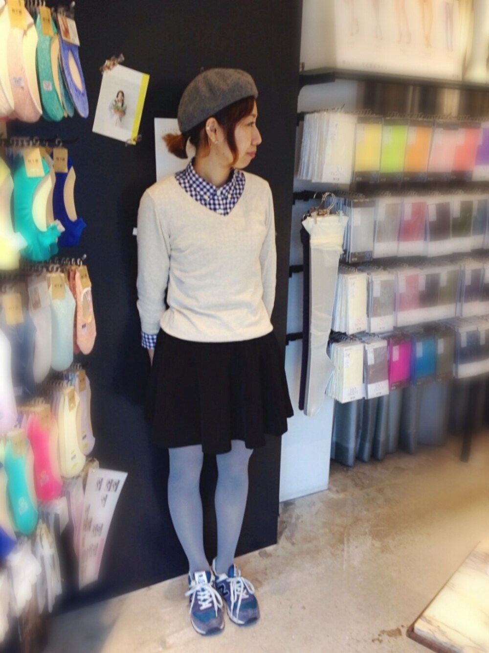 今日はスクールガールを意識したコーディネートにスニーカーではずしをプラスしました。60デニールタイツは程よい透け感で春先におすすめです♪
