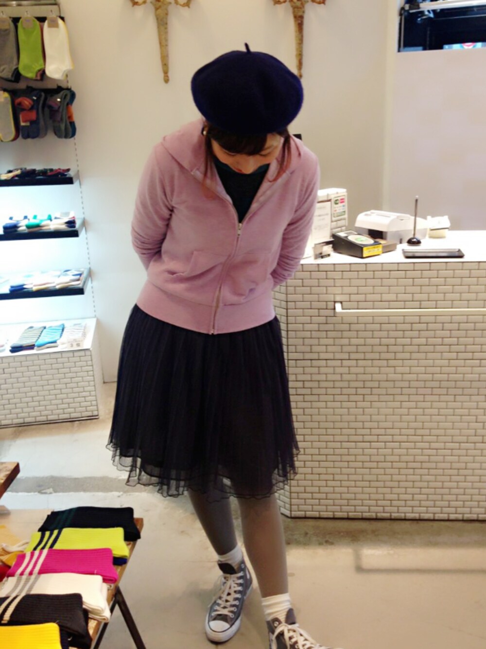 肌寒い日だったので足元は80デニールタイツを着用しました。 色を明るくすれば春先でもまだまだ厚手タイツが活躍してくれます♪