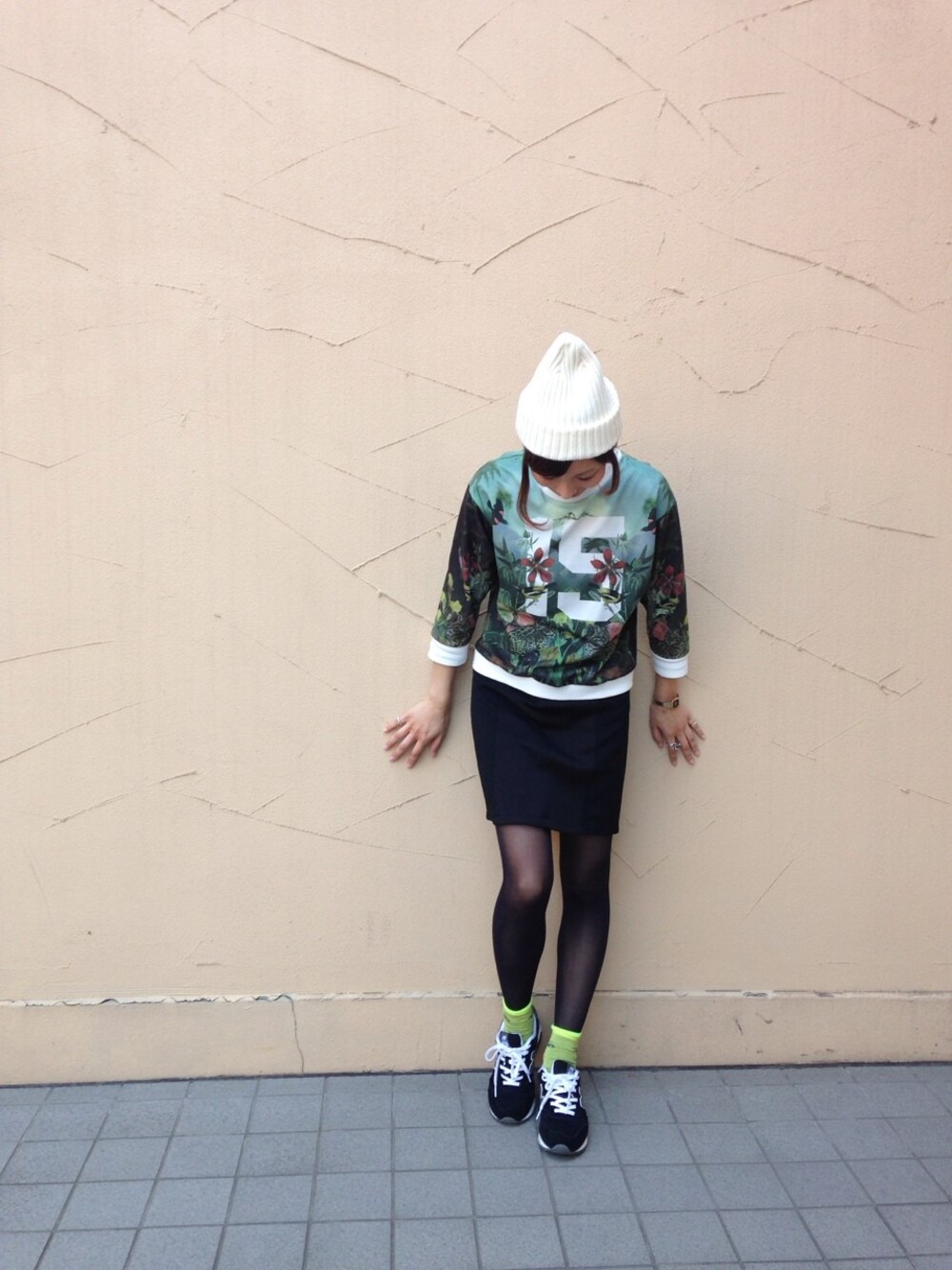 フェイス柄のソックスのカラーに合わせて全体をミドリ×クロでまとめました。