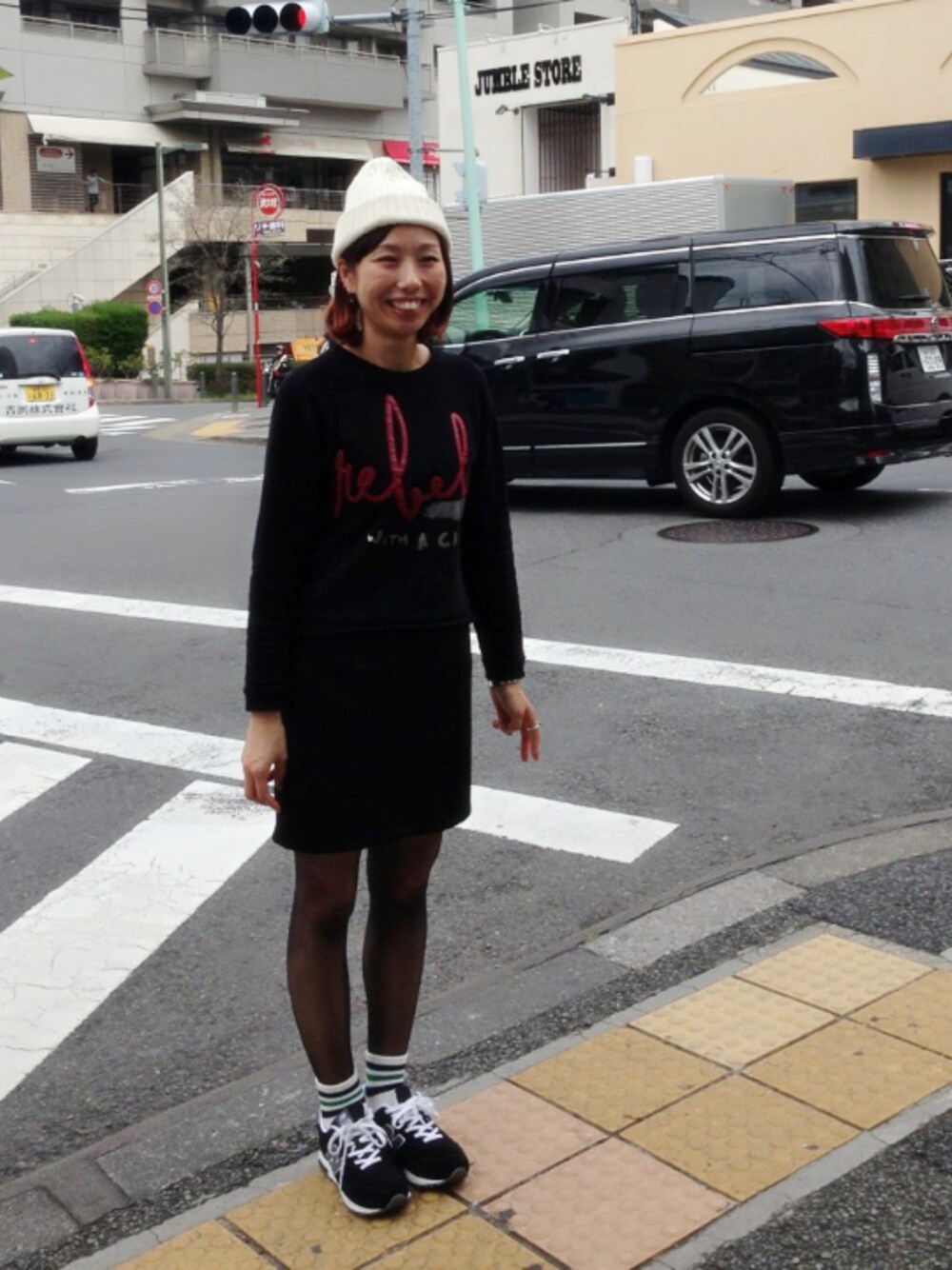今日は全身クロコーデ◎ タイツに透け感を出して重たくなりすぎないようにし、小物に白を入れてポイントにしました。 ラインソックスは店舗限定商品です。