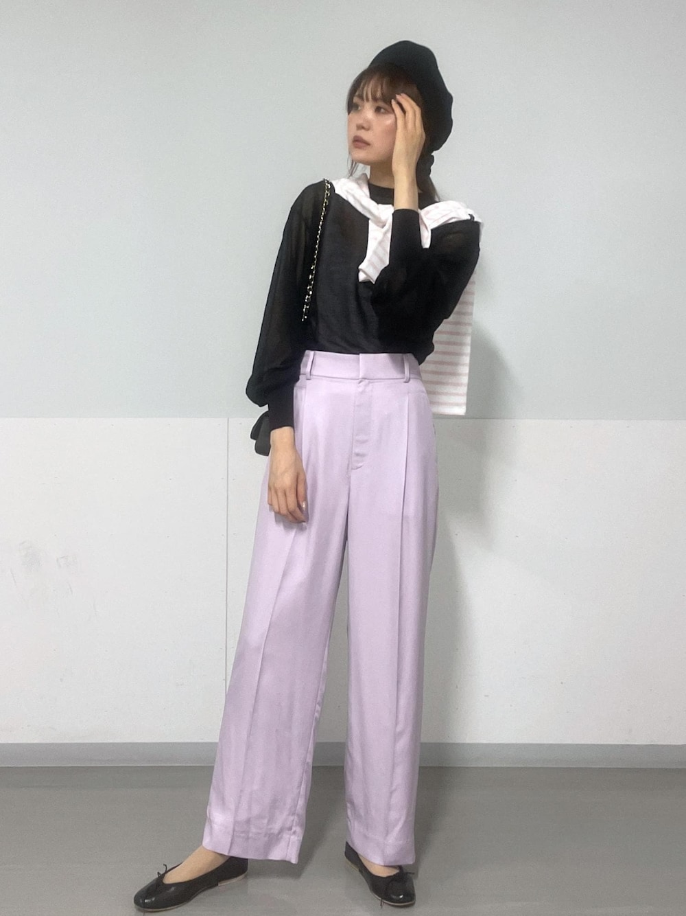 ラベンダーをメインに、コーディネートしました。 肩からカーディガンや長袖シャツをかけるだけで アクセントに♪ 【着用サイズ】 シューズ 24.5