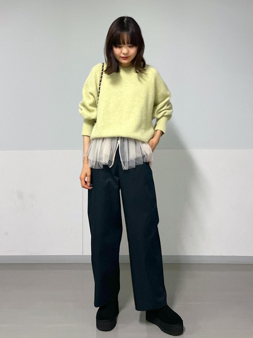 パステル寄りのイエローです。 ロングスカート、デニム、綺麗めパンツ 何にでも合いますよ。 カラーニット是非お試しくださいませ。 シューズ 24.0