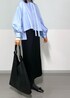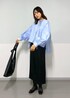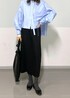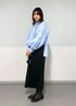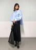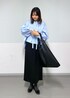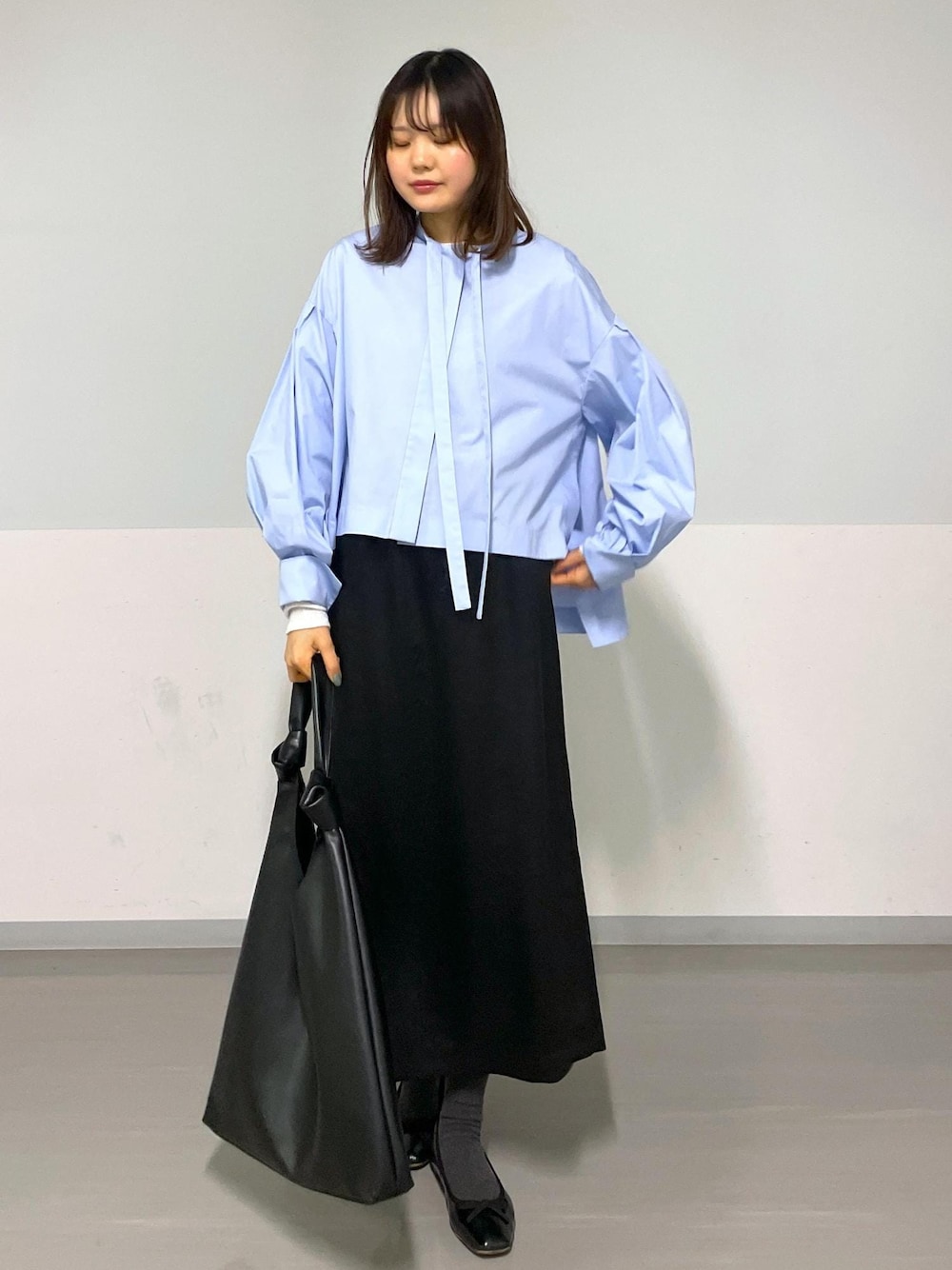 前ボタンなので羽織にもなってしまう、万能ブラウス 柔らかいブルーで肌馴染みもしやすく、腰回りも隠してくれます。 スカートは光沢感があり、動くたびにチラチラひかる素敵なデザインです。 シューズ スタッフ私物
