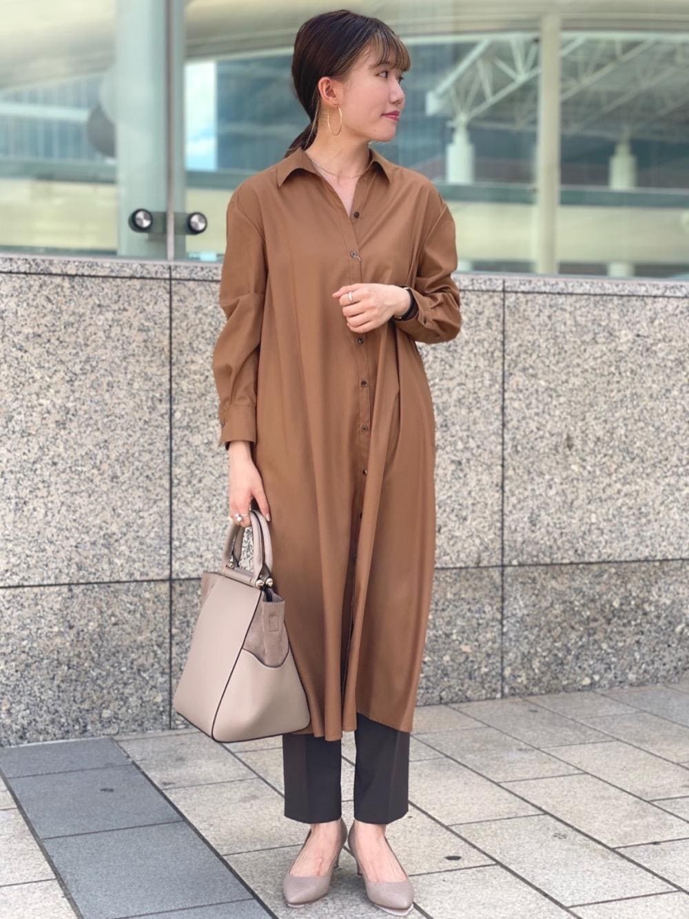 身長:153cm、着用サイズ:すべて36サイズ シャツワンピースを主役にした通勤スタイルです。今回はパンツを合わせておりますが、スリットが入っていないためonのシーンでも安心してワンピース一枚でお召しいただけます。