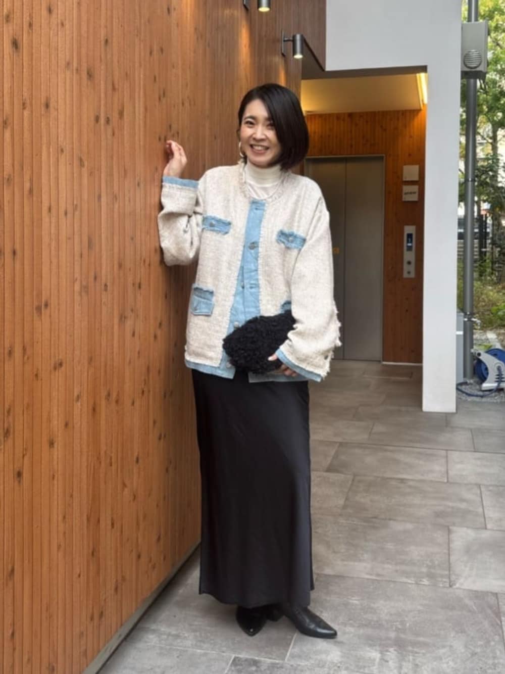 ツイードだときれいすぎるし、デニムだとカジュアルすぎる…そんな方におすすめなのが、ツイード×デニムのジャケット。 上品さと程よいラフさを兼ね備えた一枚で、大人の普段使いにちょうどいいバランスです。 ボトムスはサテンのナロースカートでシンプルに。異素材の組み合わせが奥行きを出してくれて、甘さを抑えた洗練コーデに仕上がります。抜け感のある小物合わせもポイントです。