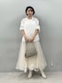 甘めが苦手な40代にも おすすめのチュールコーデ 繊細なレーストップスに ふんわり軽やかなチュールスカートを合わせた フェミニンなスタイリング。 甘さのあるアイテム同士ですが ベージュ〜アイボリーの淡いトーンでまとめることで40代でも取り入れやすい上品な雰囲気に仕上がります。 レーストップスは 程よくゆとりのあるシルエットで 体のラインを拾いにくいのも嬉しいポイント。 骨格ナチュラルさんにも馴染みやすい やわらかい素材感で、リラックスして着られます。 デニムやワイドパンツと合わせれば 甘さを抑えた大人カジュアルにも◎ チュールスカートは シンプルなニットやカットソーと合わせるだけでコーデを華やかに見せてくれる主役アイテム。 お出かけやお食事など 少しきれいめにしたい日にもおすすめのコーデです。