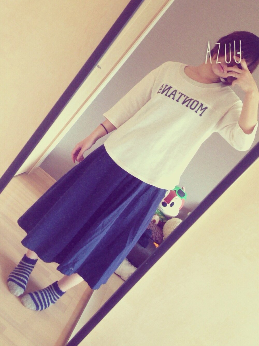 ホワイト系のTシャツ/カットソー、ブルー系のスカートを着用したレディースの秋コーディネートの1枚目の写真