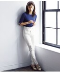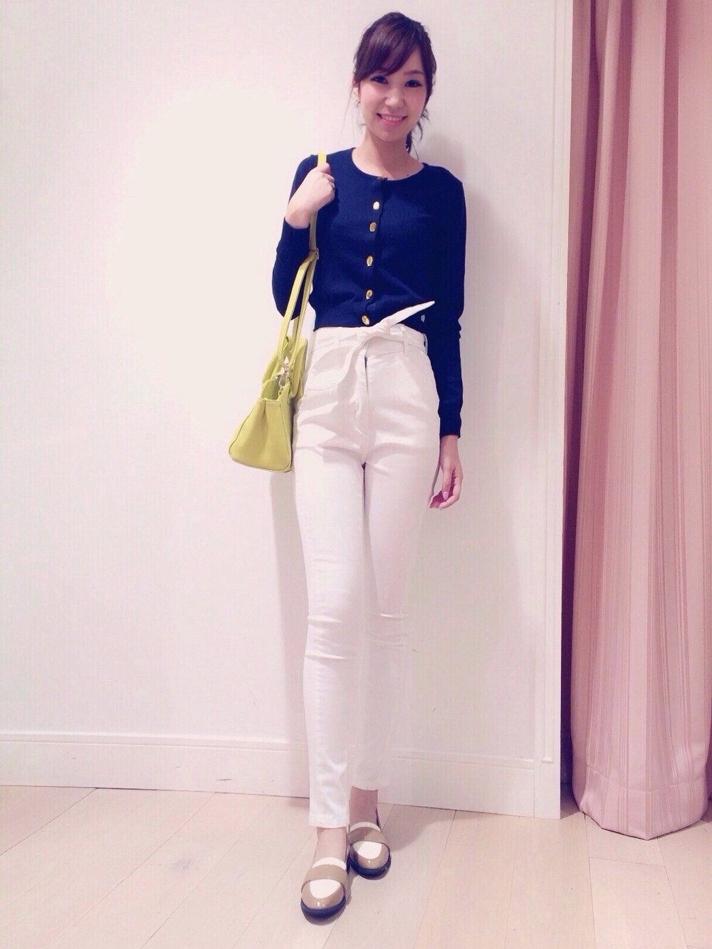 ビジューが可愛いショート丈のカーディガンにハイウエストのパンツでスタイルアップ間違えなし!!のコーデ☆彡足元はオシャレなローファーでバッグは差し色でライムをチョイス♡