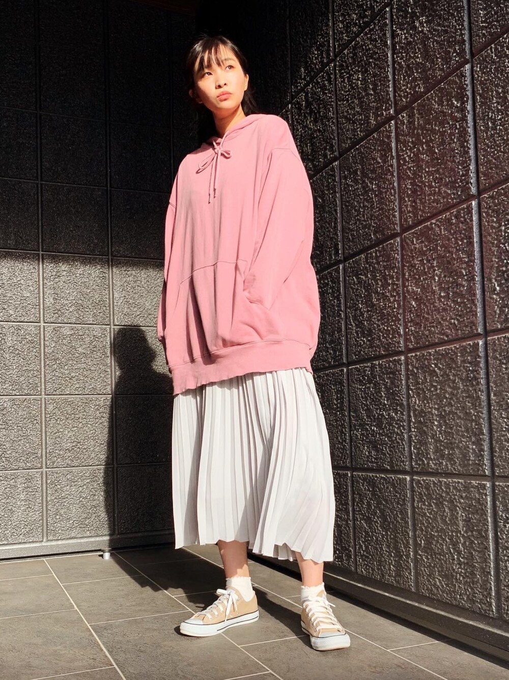 カジュアルなビッグパーカーにはきれいめなスカートで。