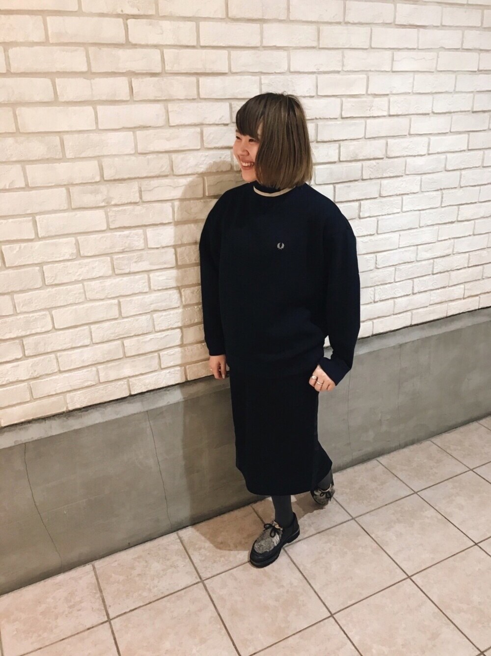 やわらかな着心地のオーバーサイズスエット。 タイトスカートと合わせてめりはりを。 1トーンのコーディネートで首元のラインをさりげないアクセントにしました。
