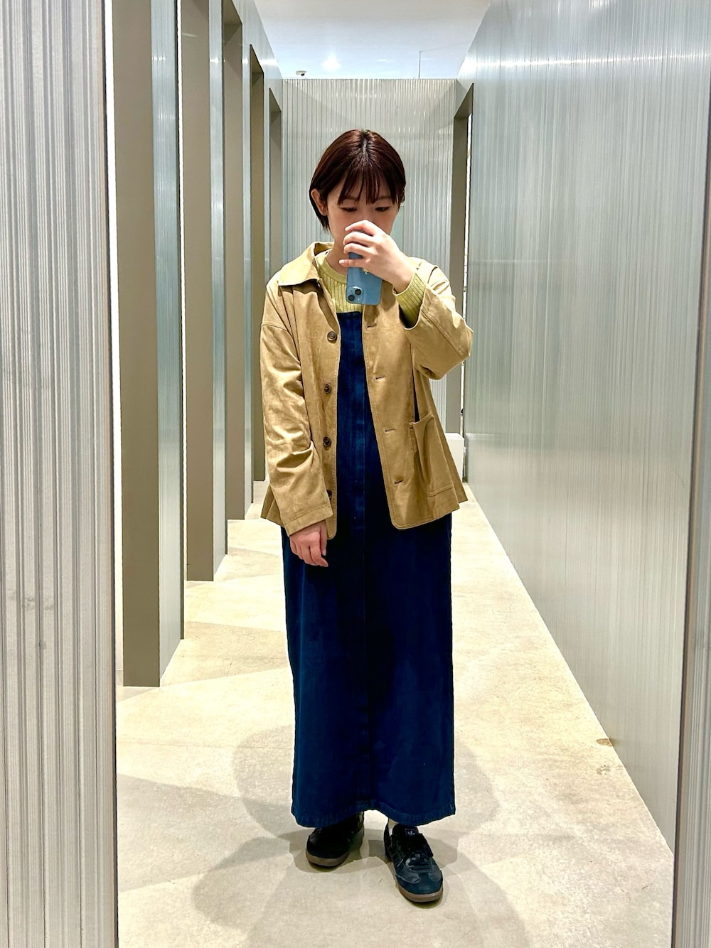 デニムのキャミワンピースを使ったカジュアルコーデ👖 インナーのピスタチオ色の薄手のニットで 春色のアクセントを加えてみました🍀 ワンピースは肩紐で長さの調整ができるので 幅広い身長の方に着ていただけます。 スウェードジャケットを着るだけで 今年らしいスタイルになるのでオススメです♡ ベージュ色はより可愛らしい印象になります♪