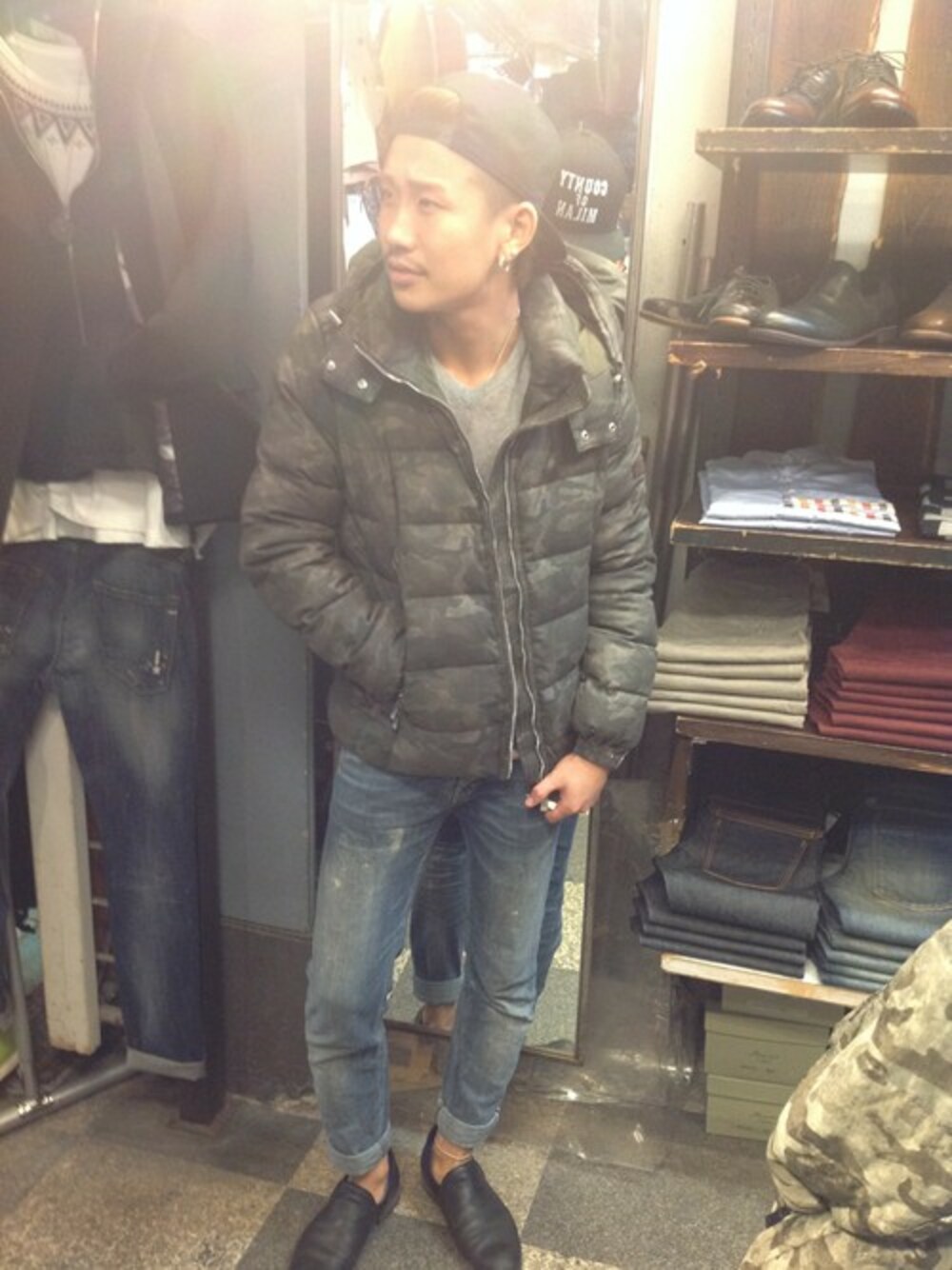 カモフラ柄のアウターが主役なので、他はシンプルに。ベーシックなアイテムでまとめました。