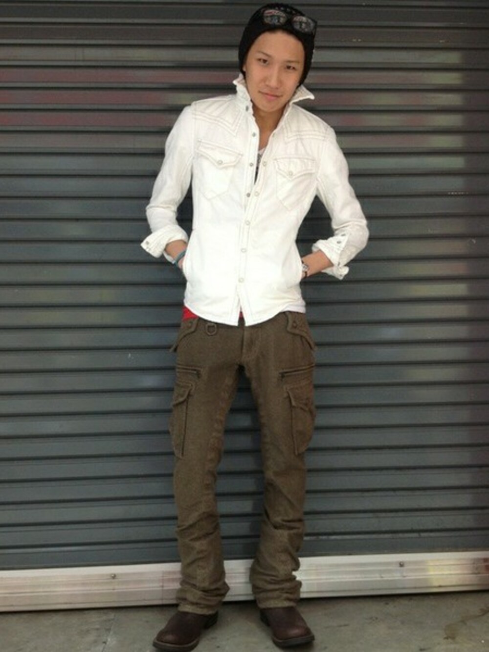 ハードなスタイリングにホワイトシャツで軽さを出しました。