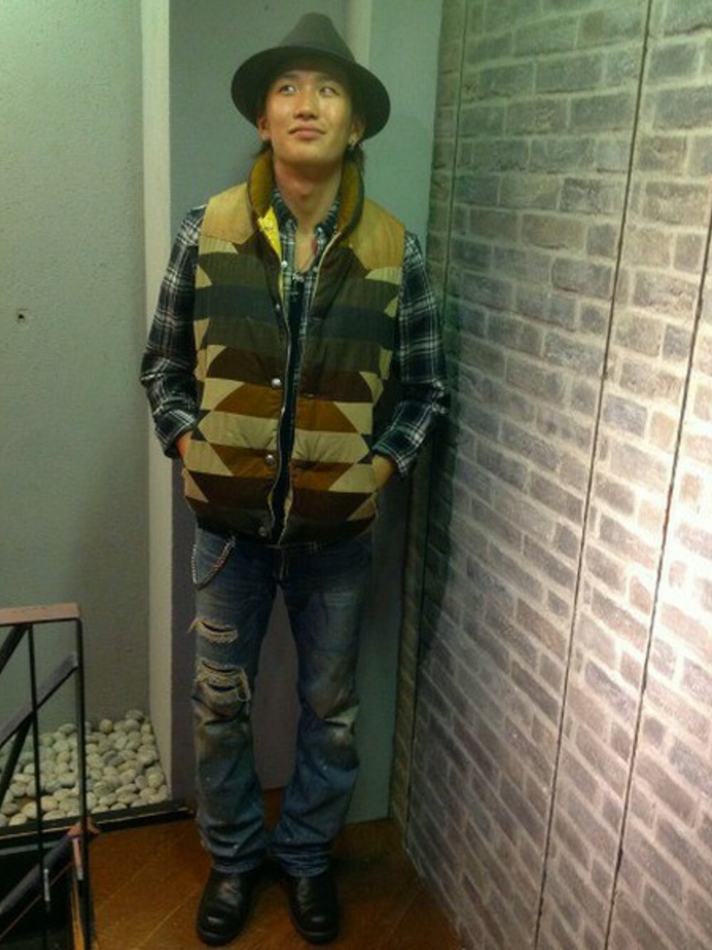 イチオシのダウンベストを使ってスタイリング! ブラックのチェックシャツを合わせて柄ON柄でもまとまりを出しました。