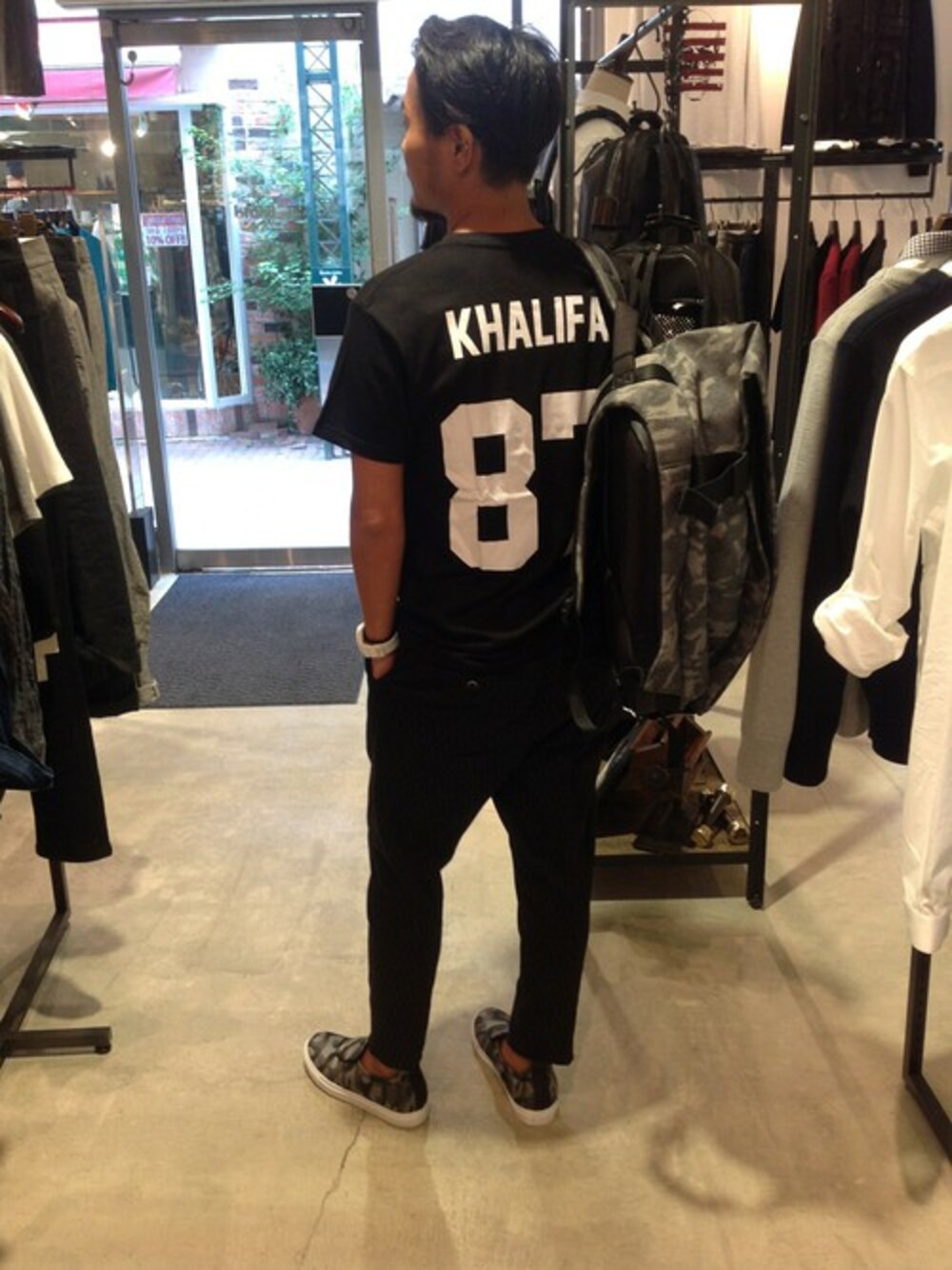 スポーティーなナンバーTでトレンド感を。オールブラックでまとめ、リュックとシューズのカモフラ柄でアクセントを加えました。