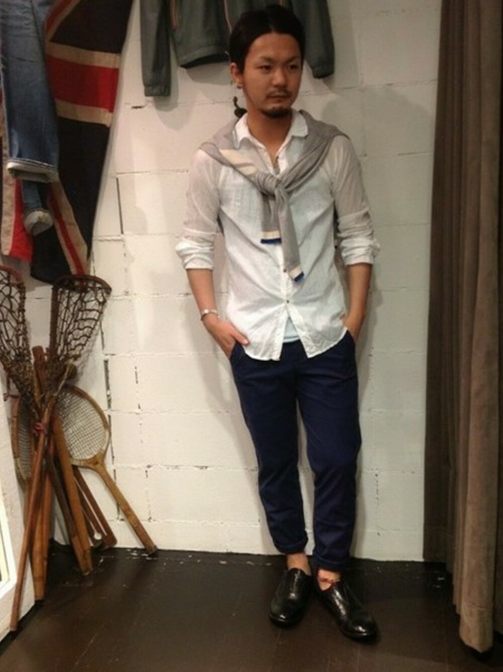 ベーシックなカラーでまとめた落ち着いたスタイル。さりげないアクセントとしてCHAN LUUをアンクレットに。