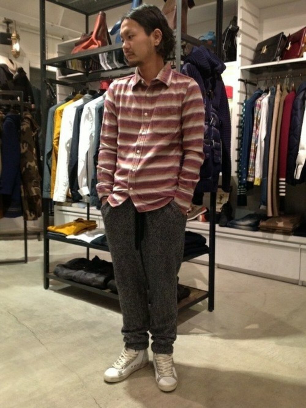暖かみのあるネイティブボーダーのシャツに、スウェット+スニーカーでまとめたラフスタイルです。