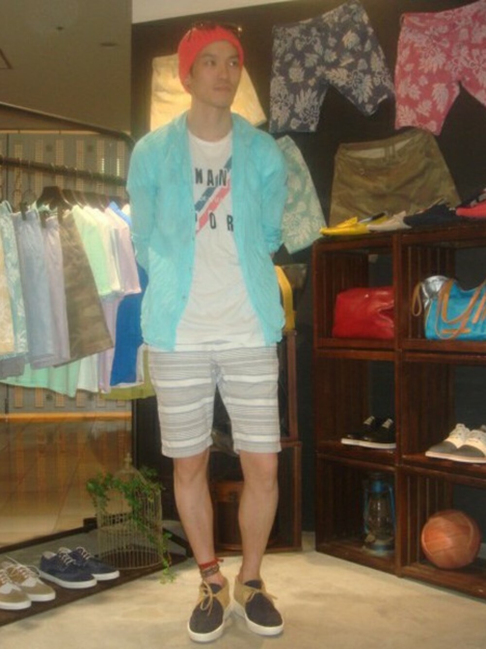 ブルーのシャツをメインに、ポイントポイントでカラーを合わせた、POPなカラーの夏スタイルです!