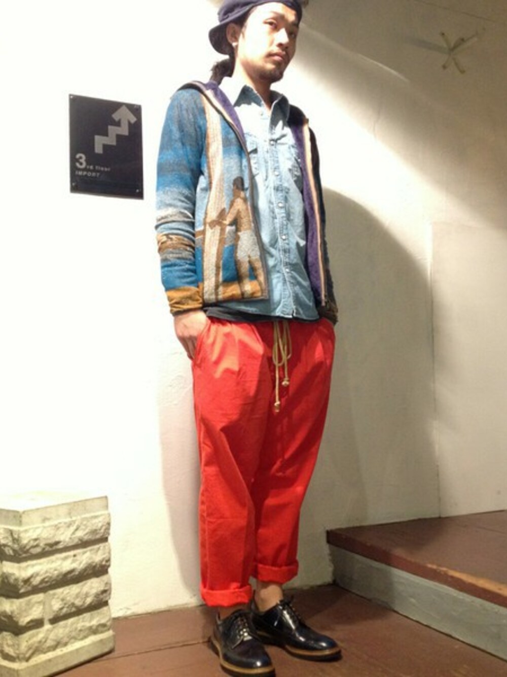 ブルーでまとまてコーディネートに、赤のボトムスでアクセントを。ほどよくパンチのあるコーディネートに♪