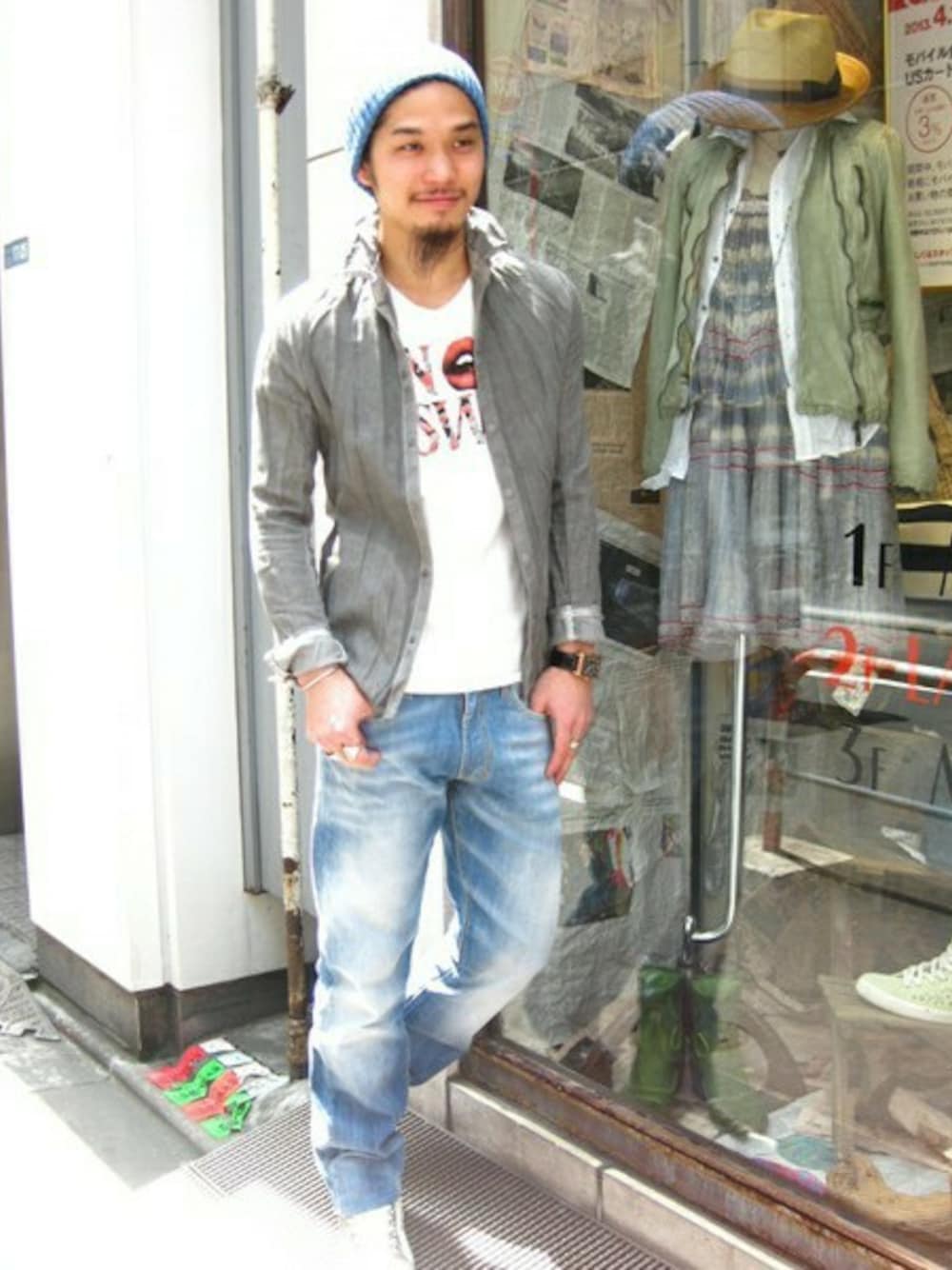 ちょっとハードなシャツ&Tシャツにあえてルーズなデニムとニットキャップで着崩しました。