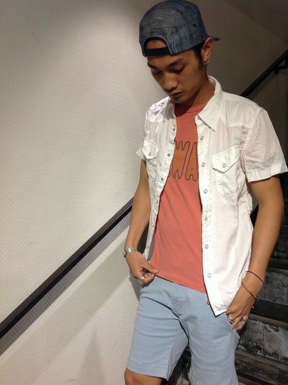 色ものでコーディネート。白シャツを羽織りにして、全体のまとまり感を出しました。