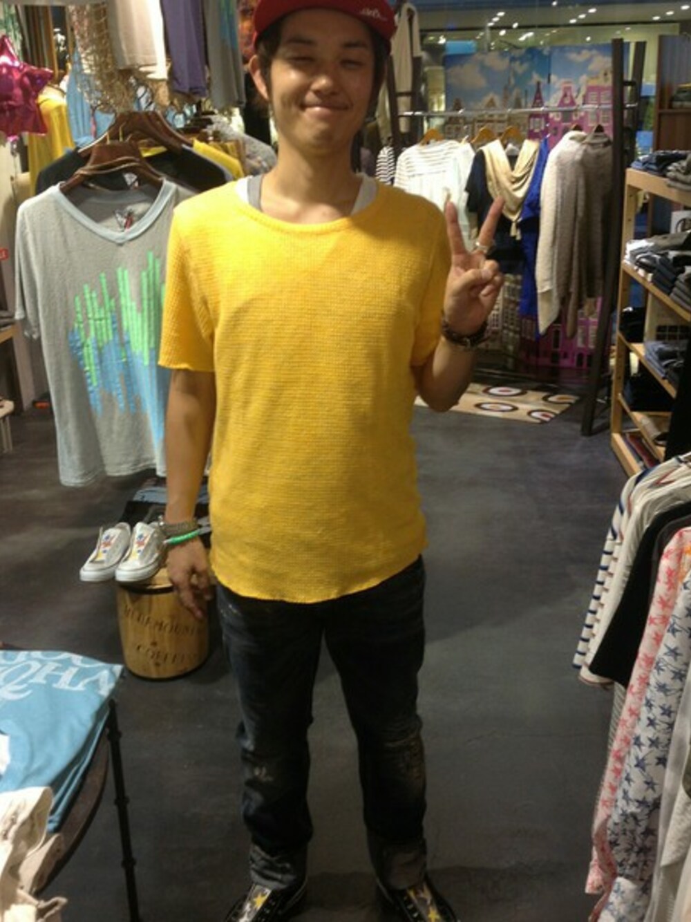 イエローのTシャツをポイントにした、シンプルな定番カジュアルスタイルです。