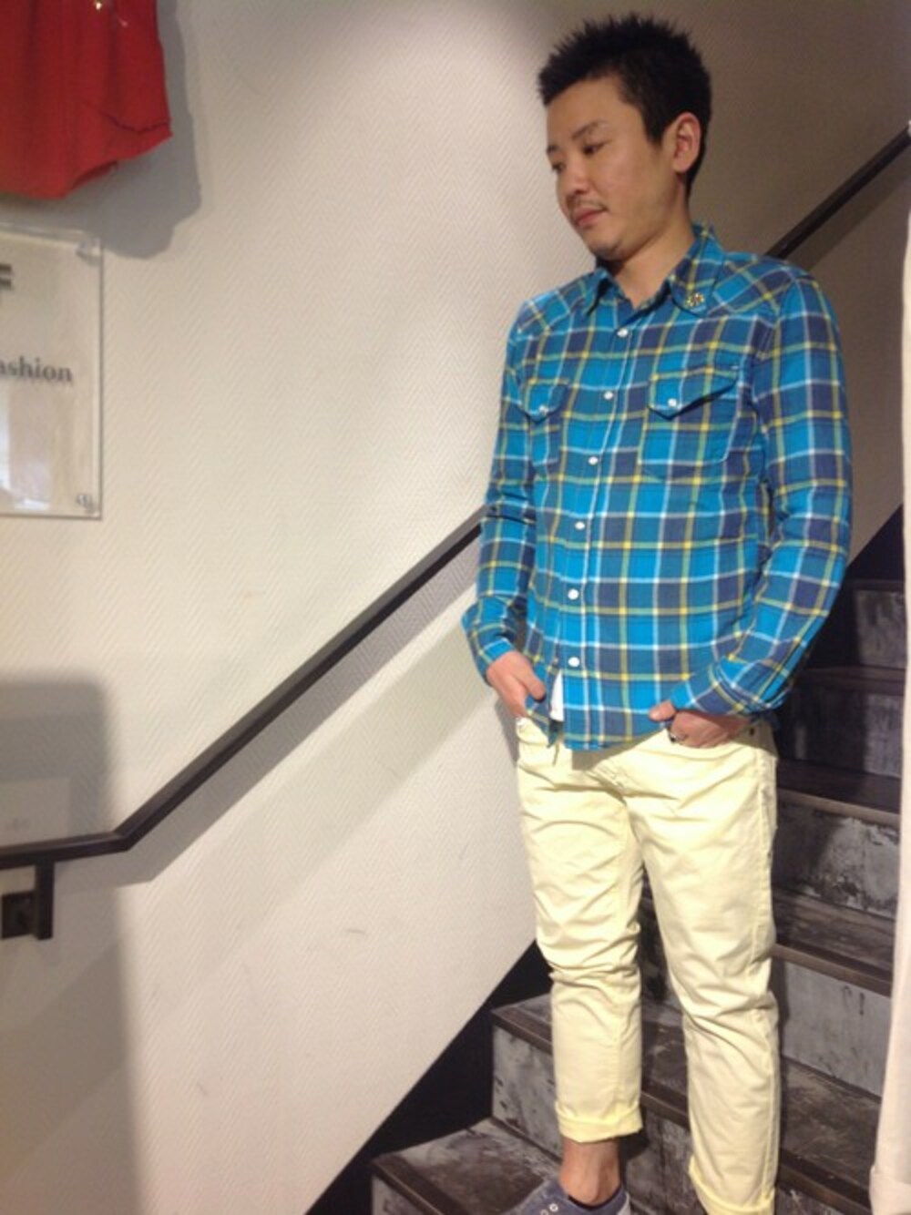 ネオンカラーのチェックが珍しいシャツは、REMI RELIEF。 パンツもイエローで春らしいカラーコーディネートを楽しみました。