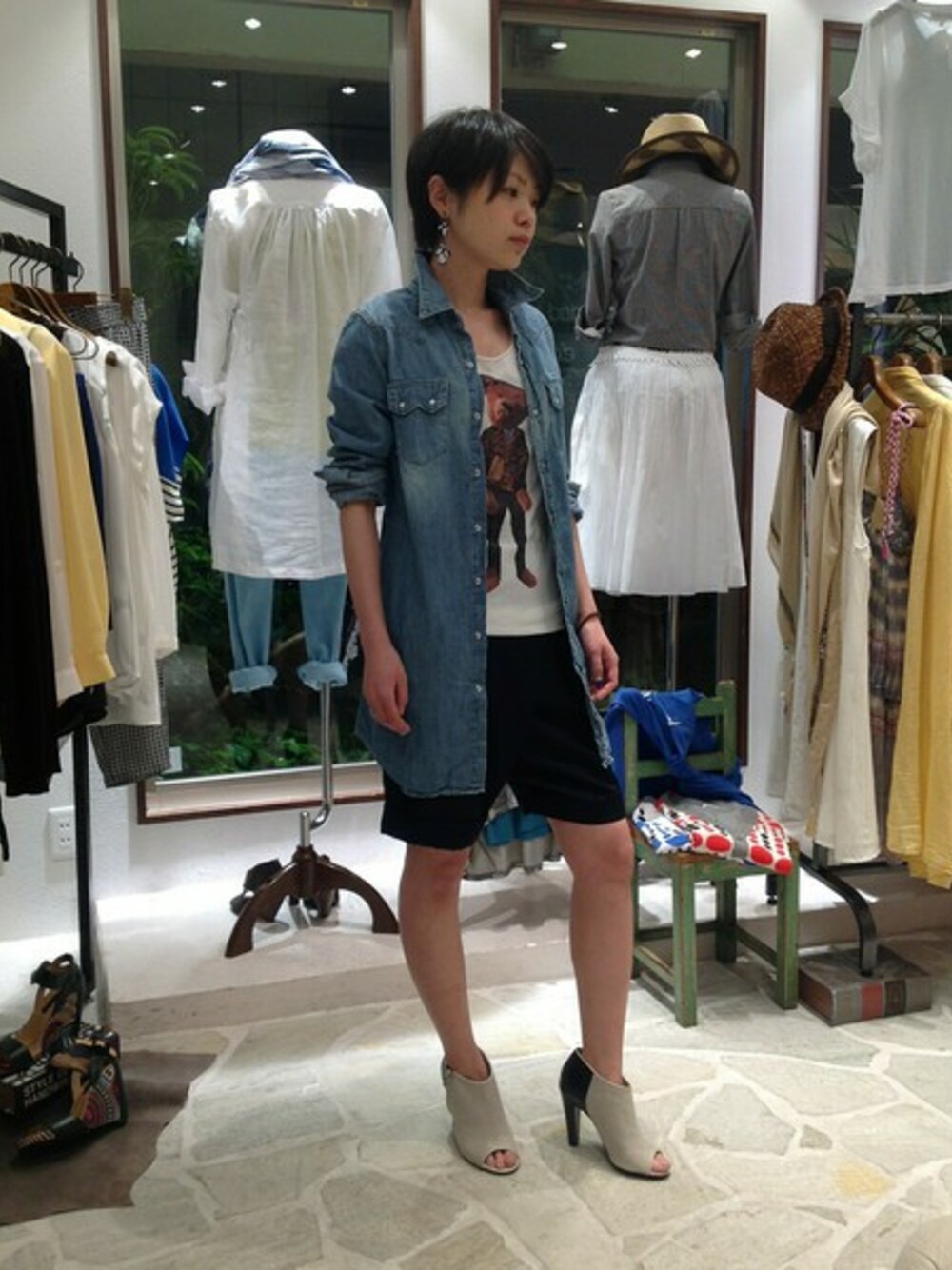 ハズシでデニムシャツを羽織り、モードとカジュアルのMIXコーディネートです。