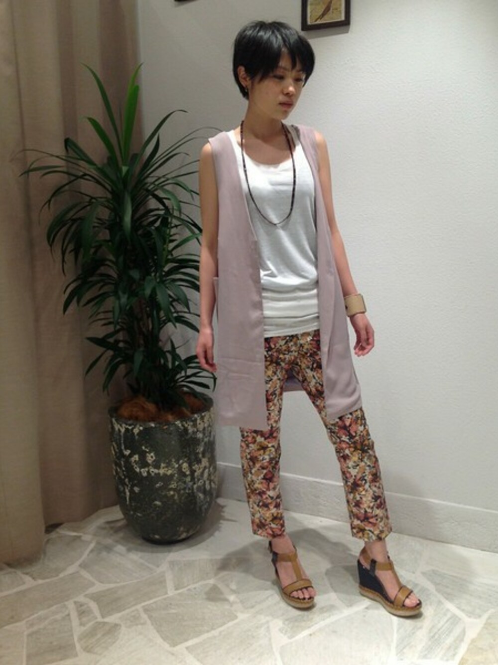ロングベストでモードにまとめながらも、暖色を使うことで柔らかい印象に。