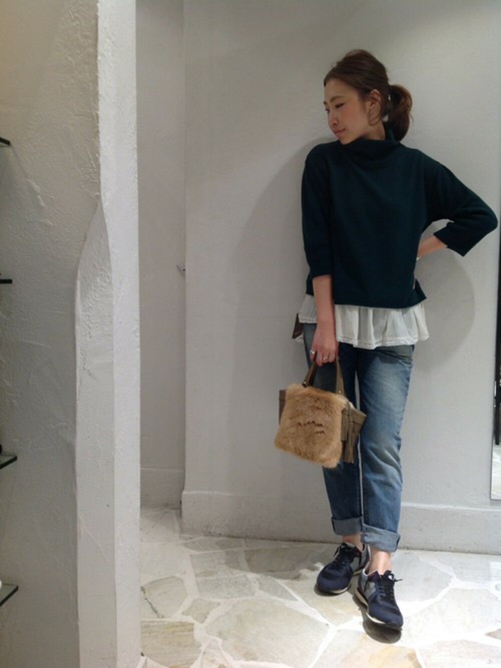 ちょっとそこまで。カジュアルでリラックス感のあるスタイリングにしました。 ファー付バッグをコーディネートのポイントに。