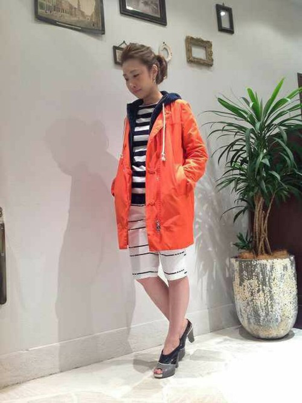 春の大人カジュアル。上下ボーダーでトレンド感を演出、鮮やかなオレンジが目を引くアウターで春らしくまとめました。