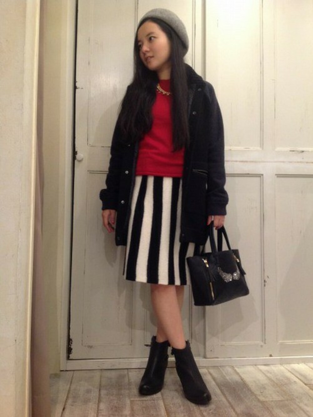今シーズンマストなスタジャン&ストライプスカートで★ 足元はヒールで引き締めて、モード感をプラスしました。