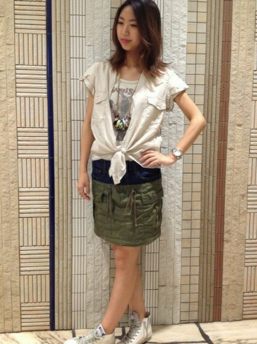 ミリタリーテイストにまとめた大人のカジュアルスタイルです。 旬な大ぶりネックレスをアクセントに☆