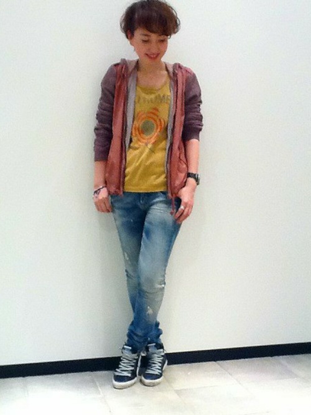 カラーものでまとめたカジュアルスタイル★アイテムそれぞれが綺麗なシルエットなので、適度な女性らしさが残ります。