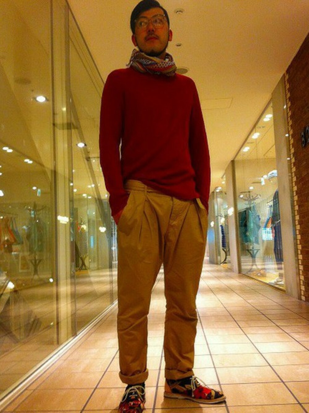 ポイントポイントで赤で統一☆さりげなく柄ものを取り入れて。