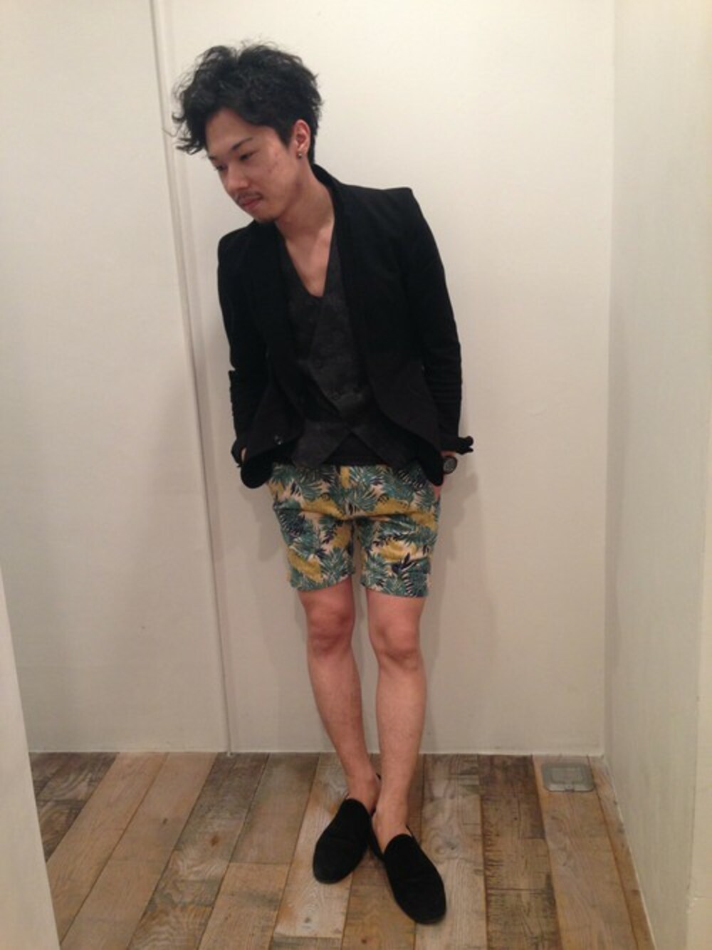 かちっとしたジャケットスタイルの外しに、REMIのアロハ柄ショーツをチョイス。 抜け感と季節感がプラスされます♪