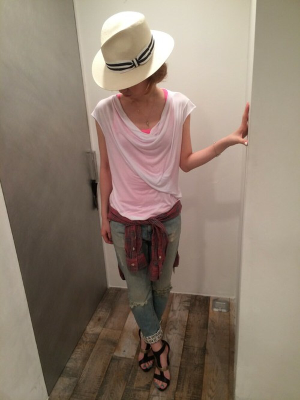 EccentricaのドレープTは、この夏活躍しそうな1枚★ 程よい透け感や、襟ぐりの開きがレイヤードを楽しむのに絶妙なバランスです!