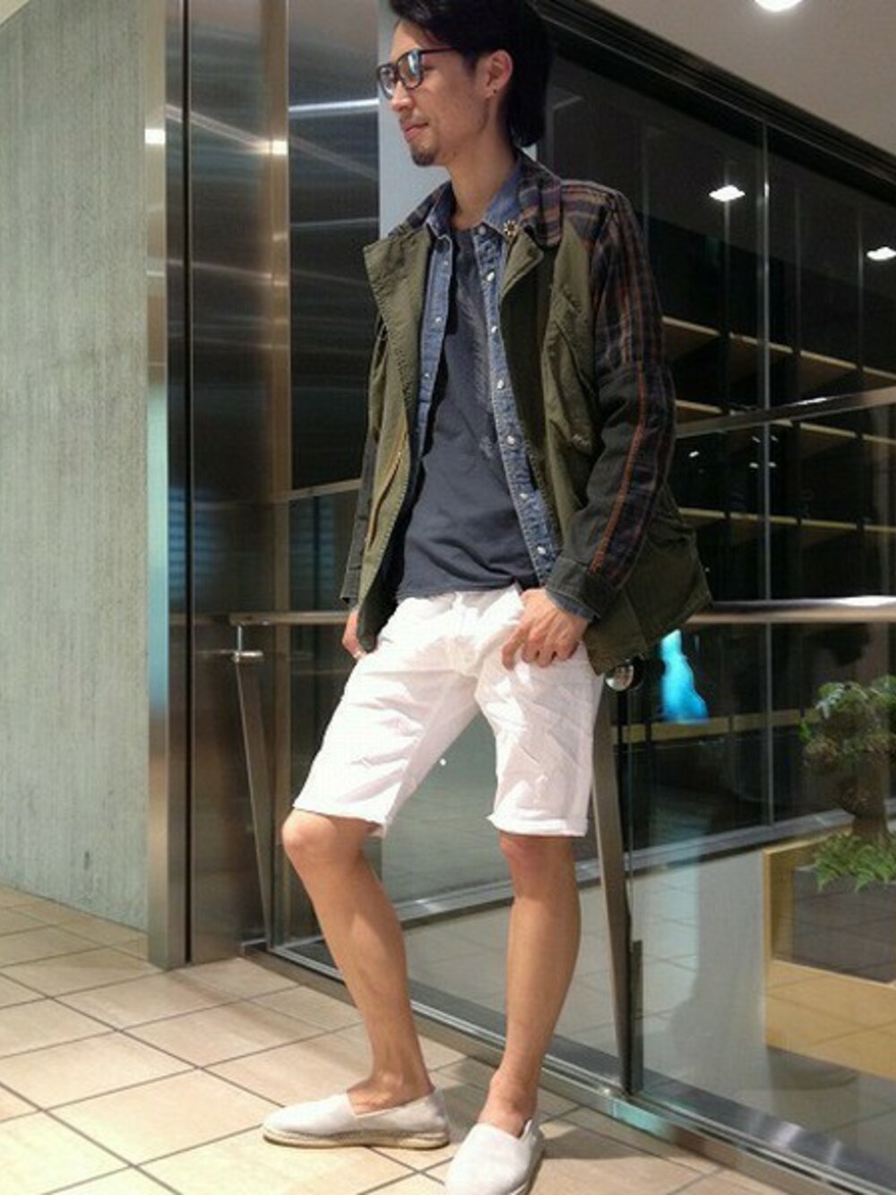 ミリタリーテイストの合わせに、ホワイトのショーツで爽やかさをプラス。