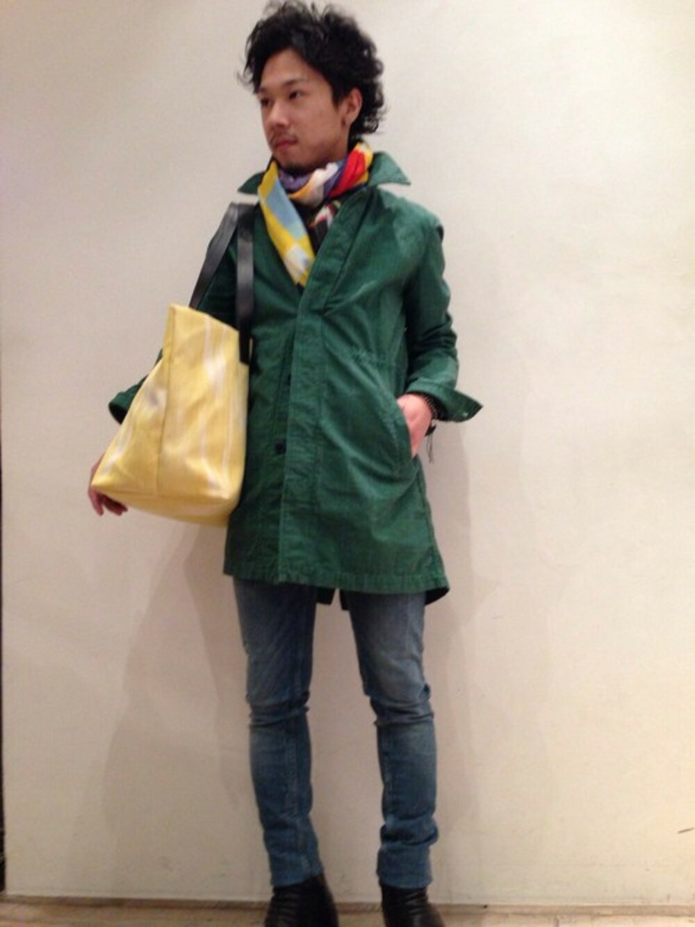 春らしく色を使ったスタイリングに! コートはよく見ると細かいグレンチェック。REMIらしいさりげなさと、色使いや素材感がポイントです。