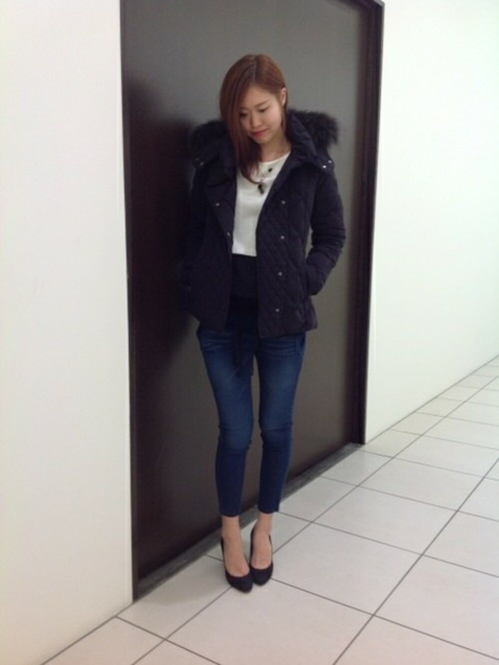 カジュアルになりがちなダウンジャケットスタイル。足元をクロップド+パンプスで華奢に仕上げて女性らしさを演出しました。