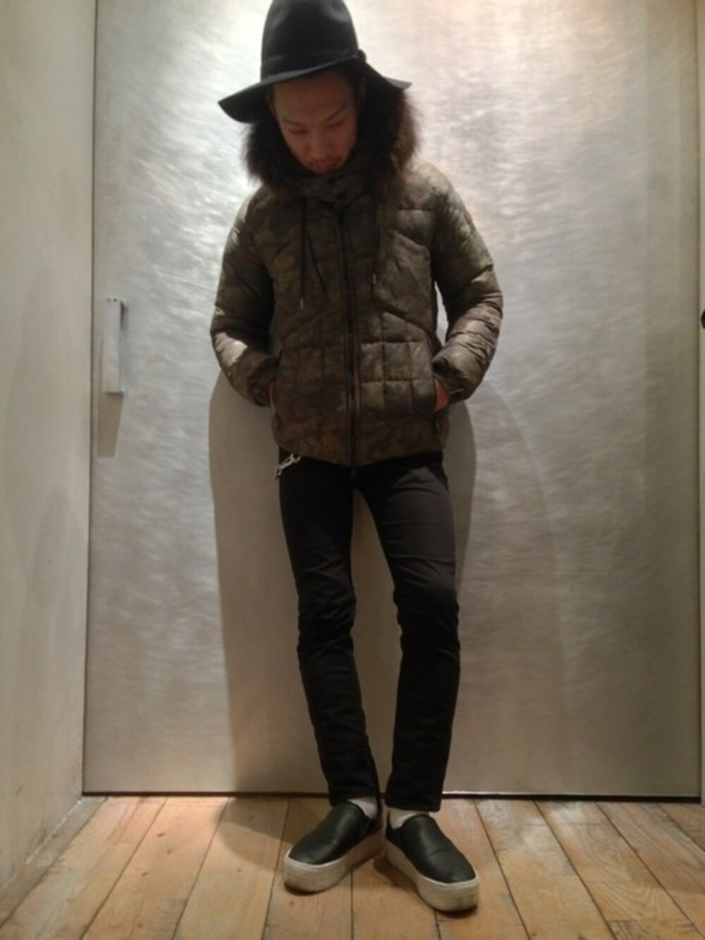 カモフラ柄のダウンを主役に、合わせるアイテムはシンプルにまとめました。 つば広ハットやスリッポンで、さりげなくトレンド感を。。。