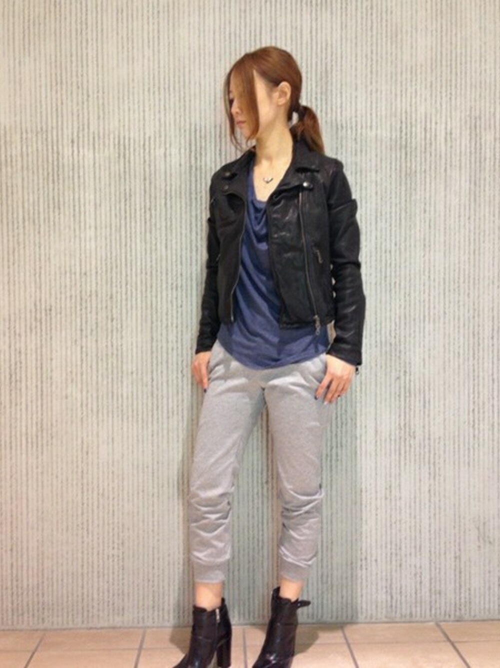 ライダースを主役にしたスタイリングに、スウェットパンツで抜け感を出しました。 モードな大人カジュアルスタイルに★