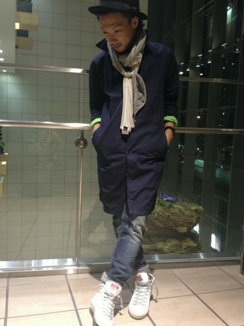 バイカラーがポイントのコートでトレンド感の匂う、大人のカジュアルスタイルです。