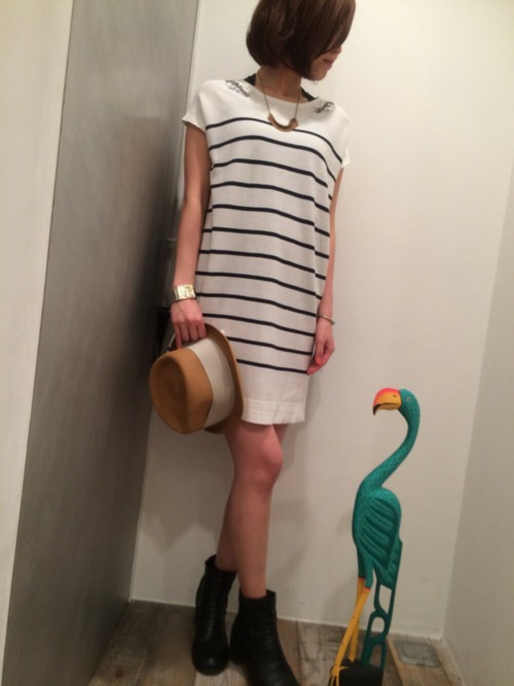 マリンテイストのボーダーとフェミニンなビジューがマッチして、カジュアルにも綺麗目にも着て頂けるワンピースです。 今回は、ショートブーツを合わせてカジュアルダウン!ゴールドのアクセサリーでポイントを。 足元をスニーカーにし、ベースボールキャップをかぶってスポーティーにコーディネートしても◎ですよ♪