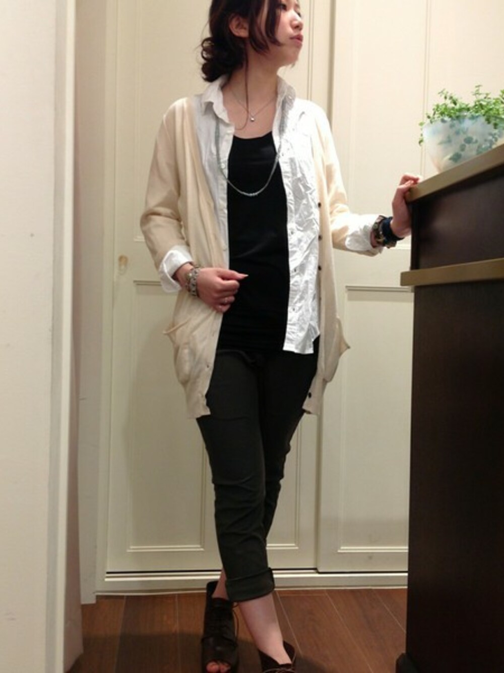 ブラックでまとめたスタイルに、ホワイトのレイヤードで軽さを☆