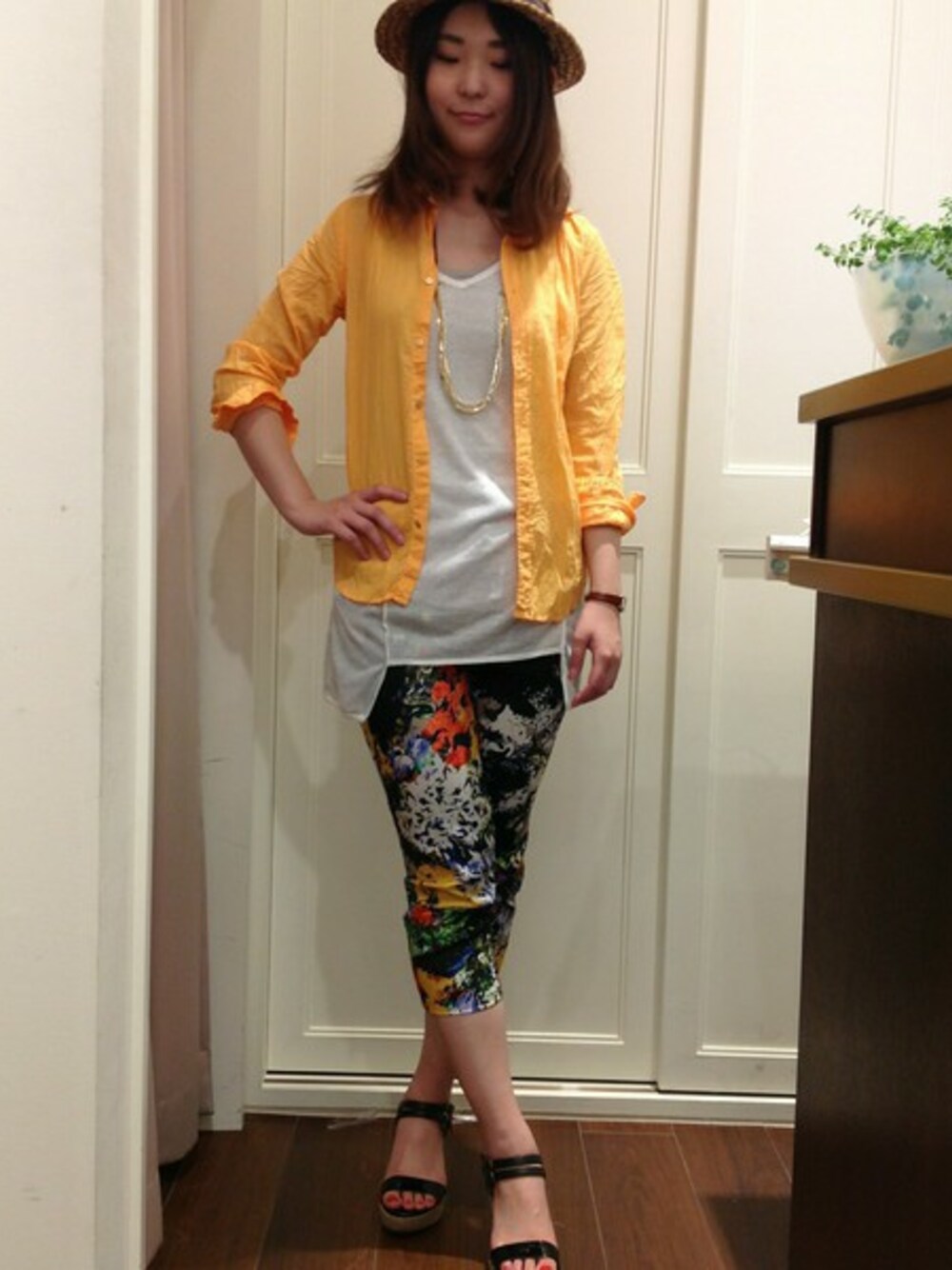 トレンドを意識した柄パンツ&カラーアイテムを使ったコーディネート。 色味を統一して品良く仕上げました。