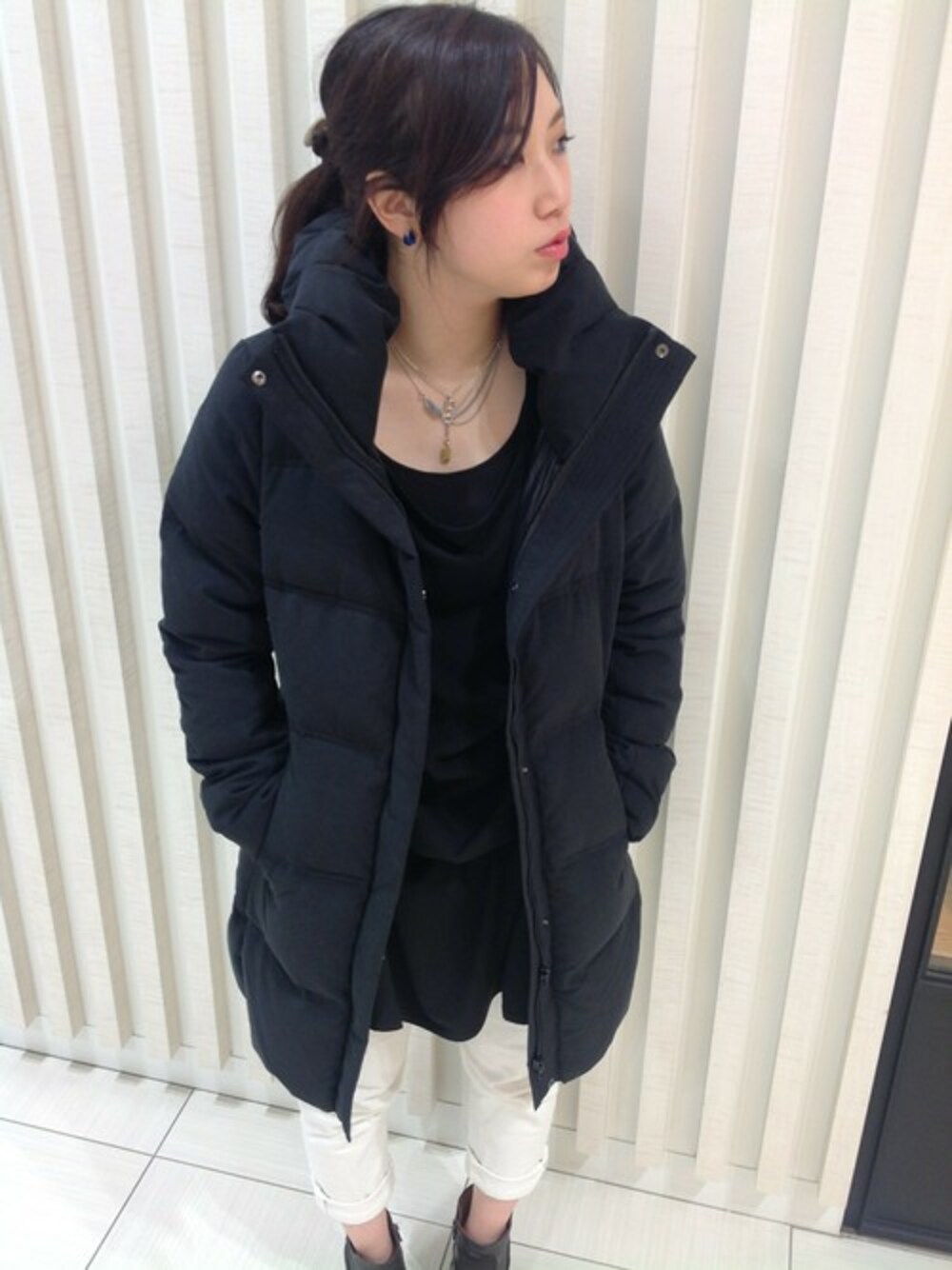 高さのあるボリューム襟がポイントで、開くとエレガントな印象に。 ダウン特有の着膨れ感が出ない細身のシルエット、マットな生地感が上品な印象です。