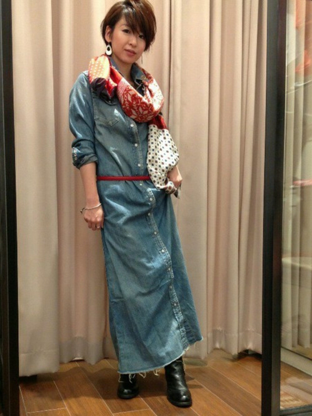 REMIのデニムマキシをメインに、アクセントカラーに赤を加えました。