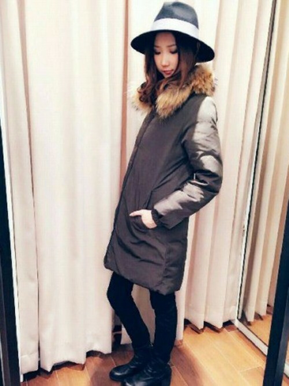カーキのダウンですっきりとした印象に。