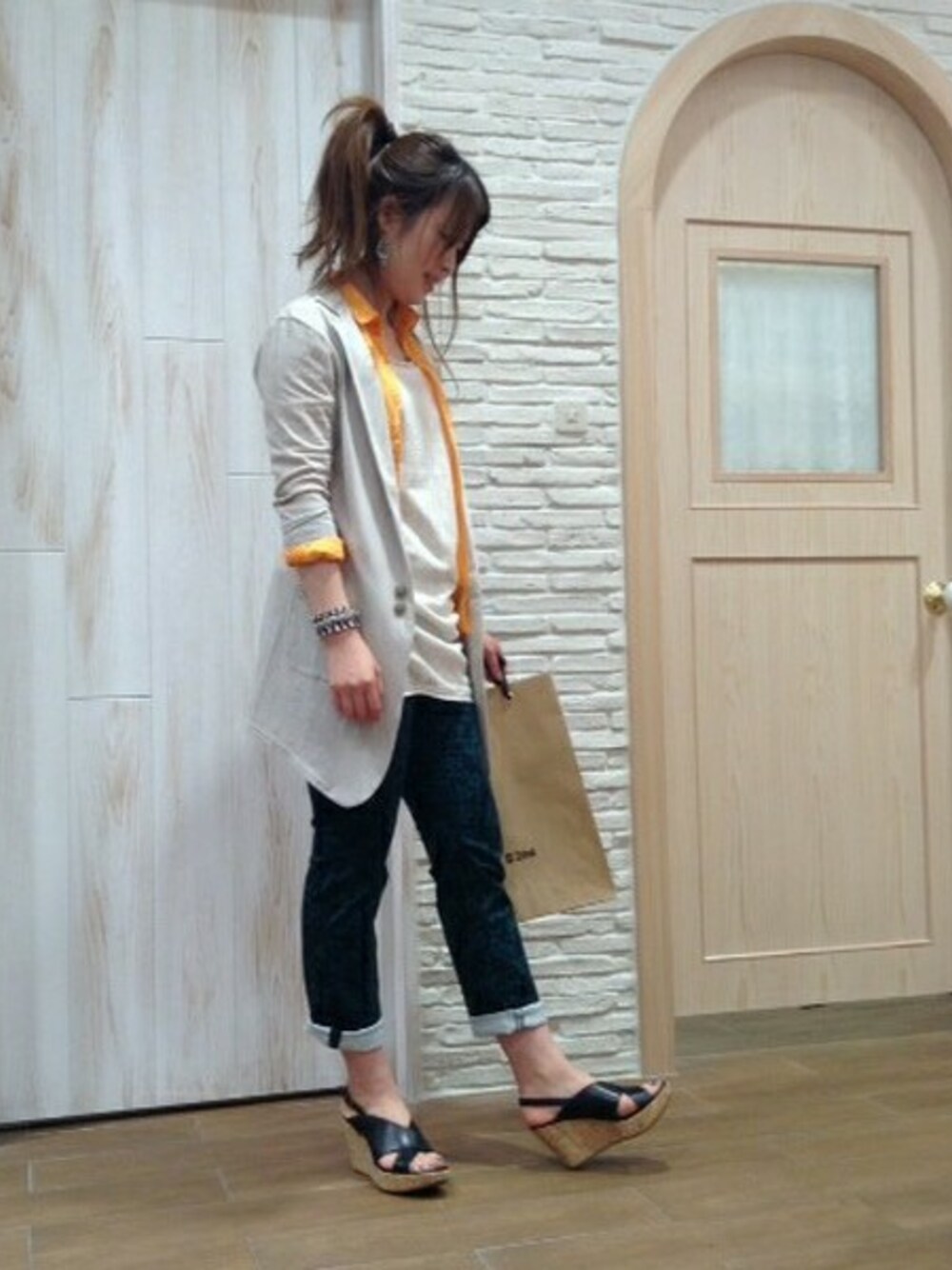 すこしマニッシュなスタイリングに、レースのインナーで女性らしさもプラス。